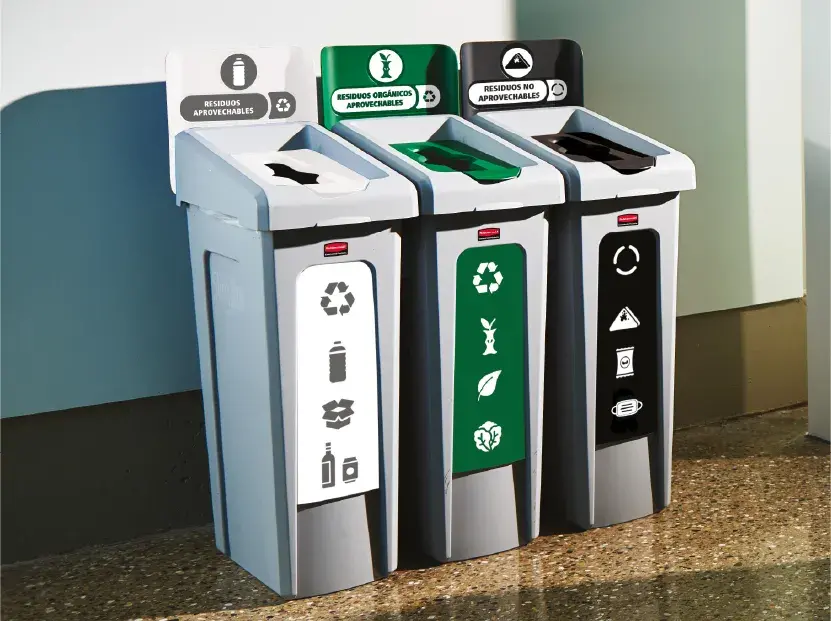 Rubbermaid cumple con los requisitos anteriores y está centrado en cimentar un legado sustentable, toda vez que su portafolio ofrece la estación de reciclaje Slim Jim disponible en los tres colores de la nueva resolución, con opciones de tapas y etiquetas claras que incluyen texto e imágenes para una codificación intuitiva, que fomenta un reciclaje fácil y efectivo. La solución más eficiente para la recolección, el transporte y la eliminación de desechos y materiales reciclables de flujo múltiple.