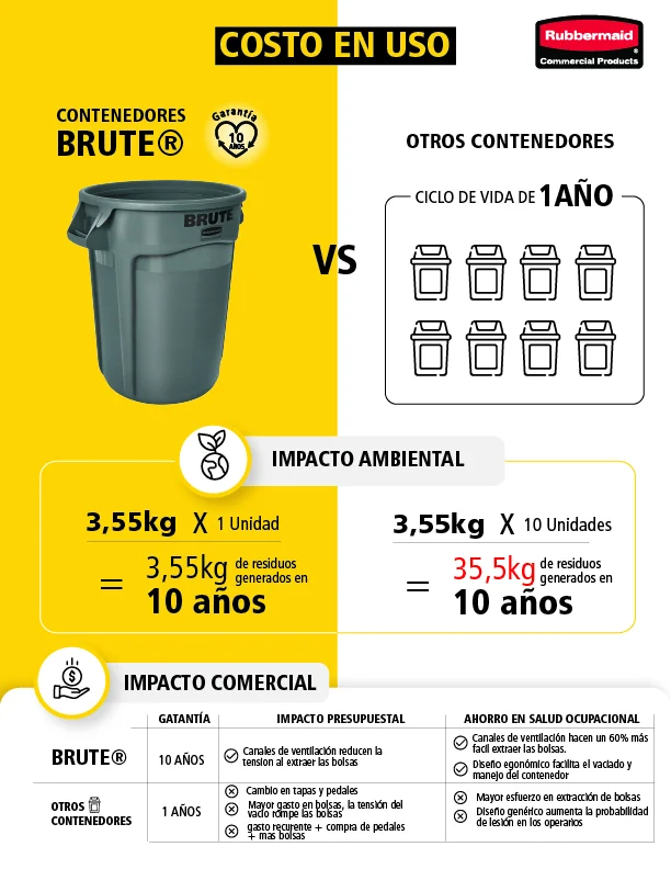 Comprar las soluciones de RCP no es un gasto, sino una inversión sustentable e inteligente para su negocio. Esto se debe a que nuestros productos tienen una durabilidad superior a la de otros productos de menor calidad, que se deterioran y se rompen con facilidad. Por ejemplo, nuestros contenedores BRUTE® tienen una garantía de 10 años, lo que significa que solo necesita comprar un BRUTE cada 10 años. En cambio, si compra un producto de menor calidad con una durabilidad para uso comercial o industrial de solo 1 año, tendrá que desembolsar el monto de 10 canecas, generar más residuos al botarlas y usar más recursos para producir y transportarlas, lo que representa un mayor costo, un mayor impacto ambiental negativo y un mayor consumo de energía y materias primas. Entonces, elegir nuestras soluciones es una inversión más económica a mediano y largo plazo, y tiene un impacto medioambiental positivo, al reducir la generación de residuos y el uso de recursos.